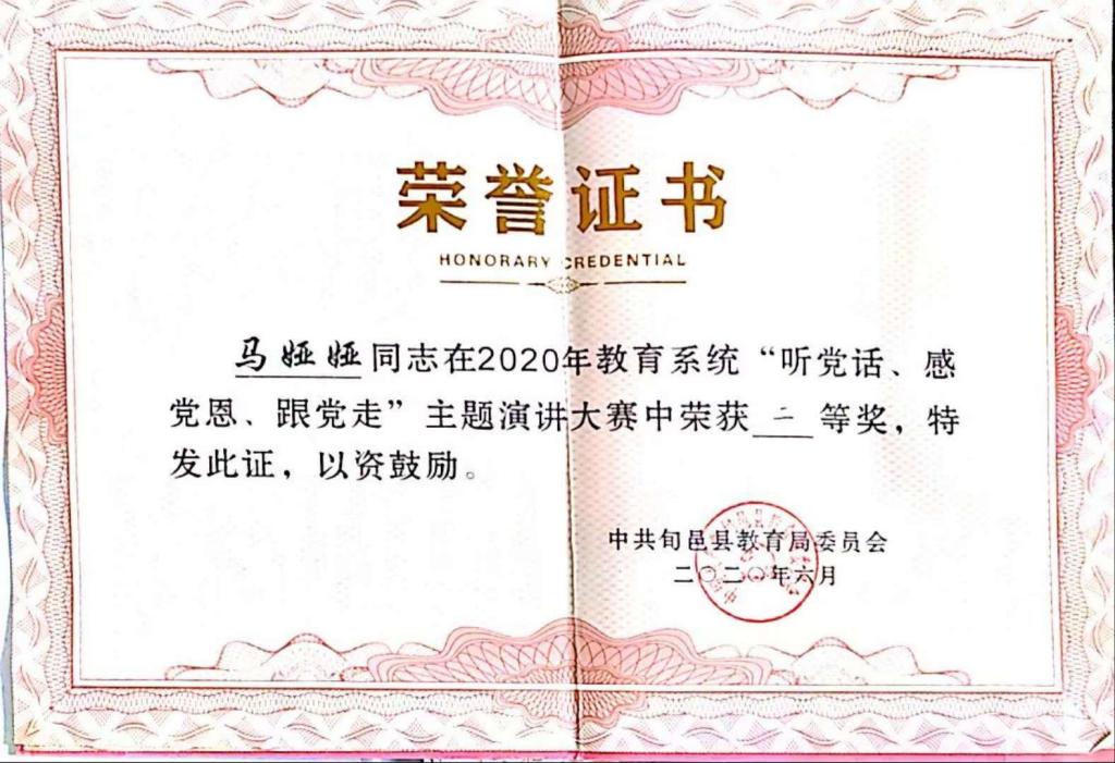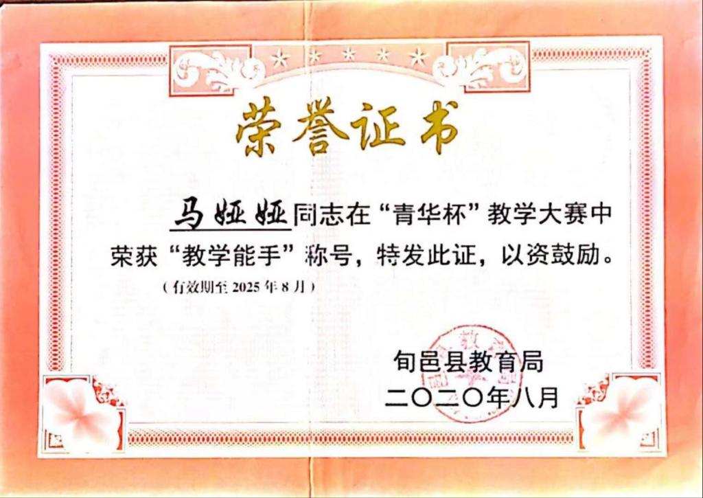 我热爱我的家乡,我亦热爱农村教育事业,而我热爱的也给予了我肯定。从业期间,我参与课题《如何在英语课堂教学中进行学困生转化》并获得市级立项;参与陕西省“奋斗陕西”奋斗人物录制活动;在旬邑县“青华杯”教学大赛中荣获“教学能手”称号;在旬邑县“2022年教学能手大赛”活动中荣获教坛新秀称号;在旬邑县“听党话,感党恩,跟党走”主题演讲大赛中荣获二等奖;在旬邑县“弘扬好家风,文明新时代”主题演讲中荣获三等奖;在旬邑县总工会“党在我心中,当好主人翁,争做新时代最美奋斗者”主题演讲赛中荣获三等奖;在旬邑县教育系统“学党史,听党话,感党恩,跟党走”主题演讲大赛中荣获三等奖;在太村镇赤道九年制寄宿学校“弘扬爱国奋斗精神,建国立业新时代”师德师风演讲比赛中荣获一等奖;在太村镇赤道九年制寄宿学校“弘扬好家风,文明新时代”演讲比赛中荣获一等奖;在“弘扬爱国奋斗精神,建国立业新时代”师德师风演讲比赛一等奖;在旬邑县第六届“青少年经典诵读”大赛中荣获优秀指导老师称号;被评为太村镇赤道九年制寄宿学校2019-2020学年度教学能手;在太村镇赤道九年制寄宿学校微型课技能大赛中被评为优胜个人;在太村镇赤道九年制寄宿学校春季微型课活动中,荣获一等奖。