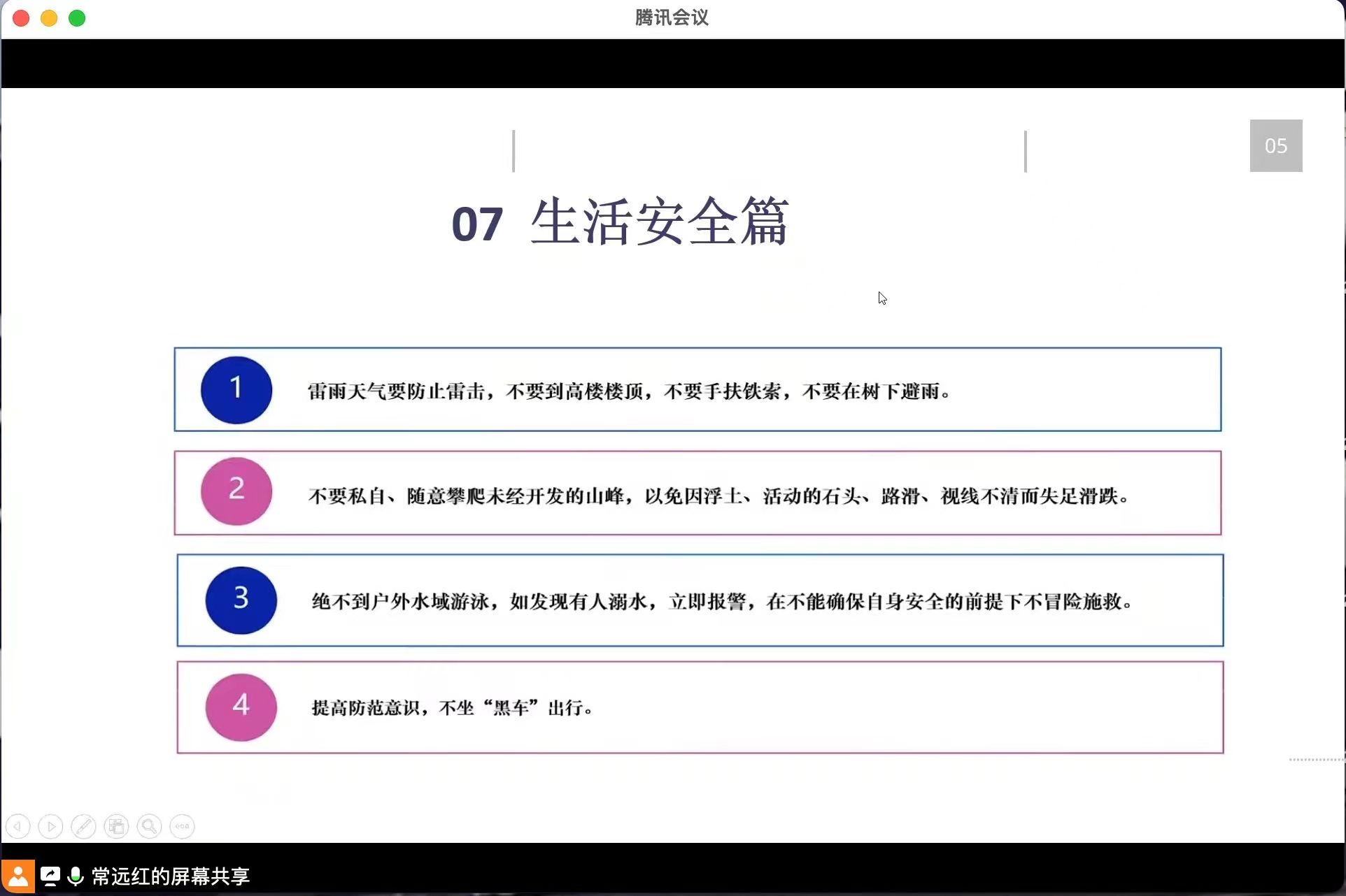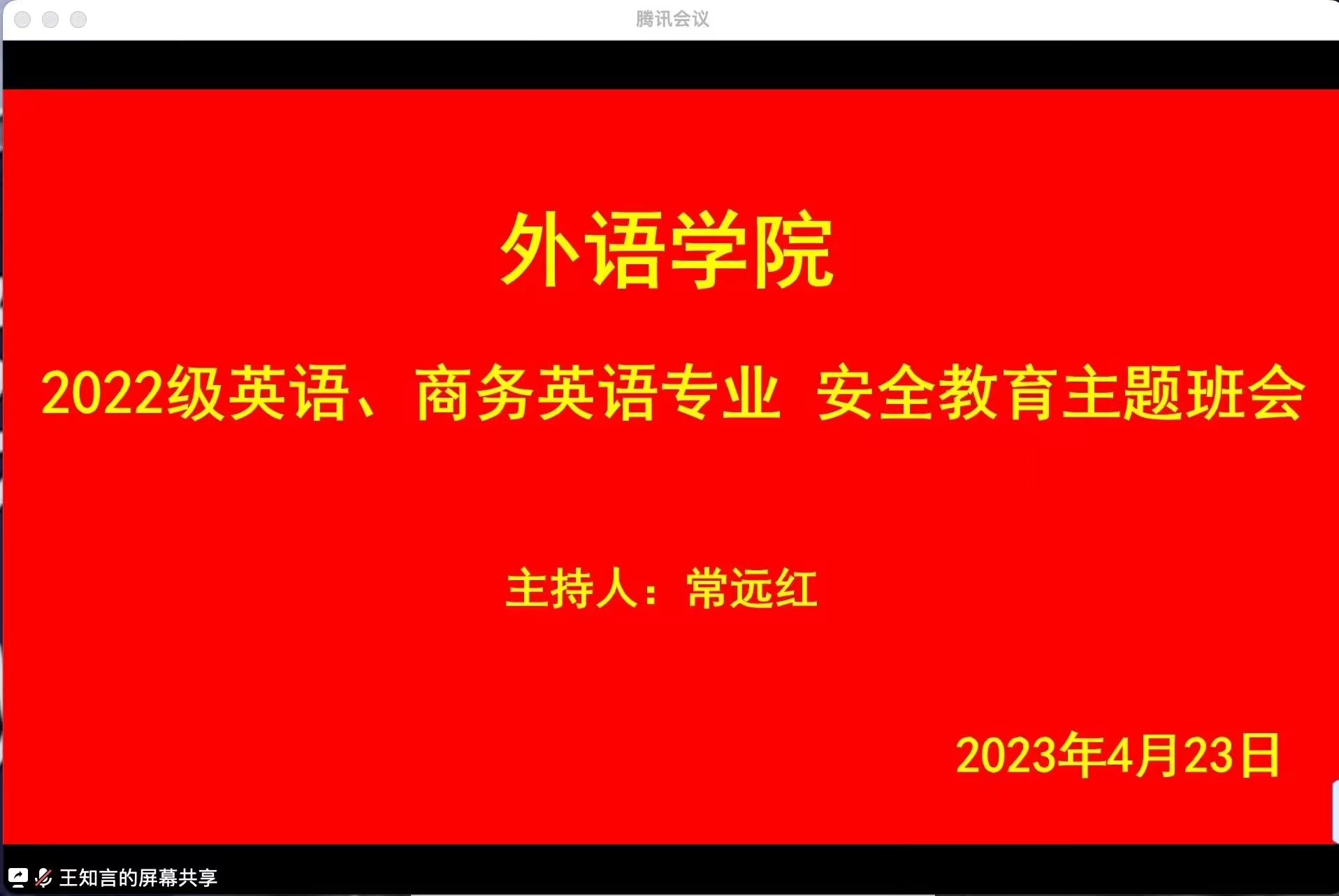 为了增强37000cm威尼斯大学生的安全防范意识,2023年4月23日晚上七点半,辅导员常老师通过腾讯会议召开了以“安全教育”为主题的班会,37000cm威尼斯22级学生全员参与其中,本次班会开展的十分顺利。