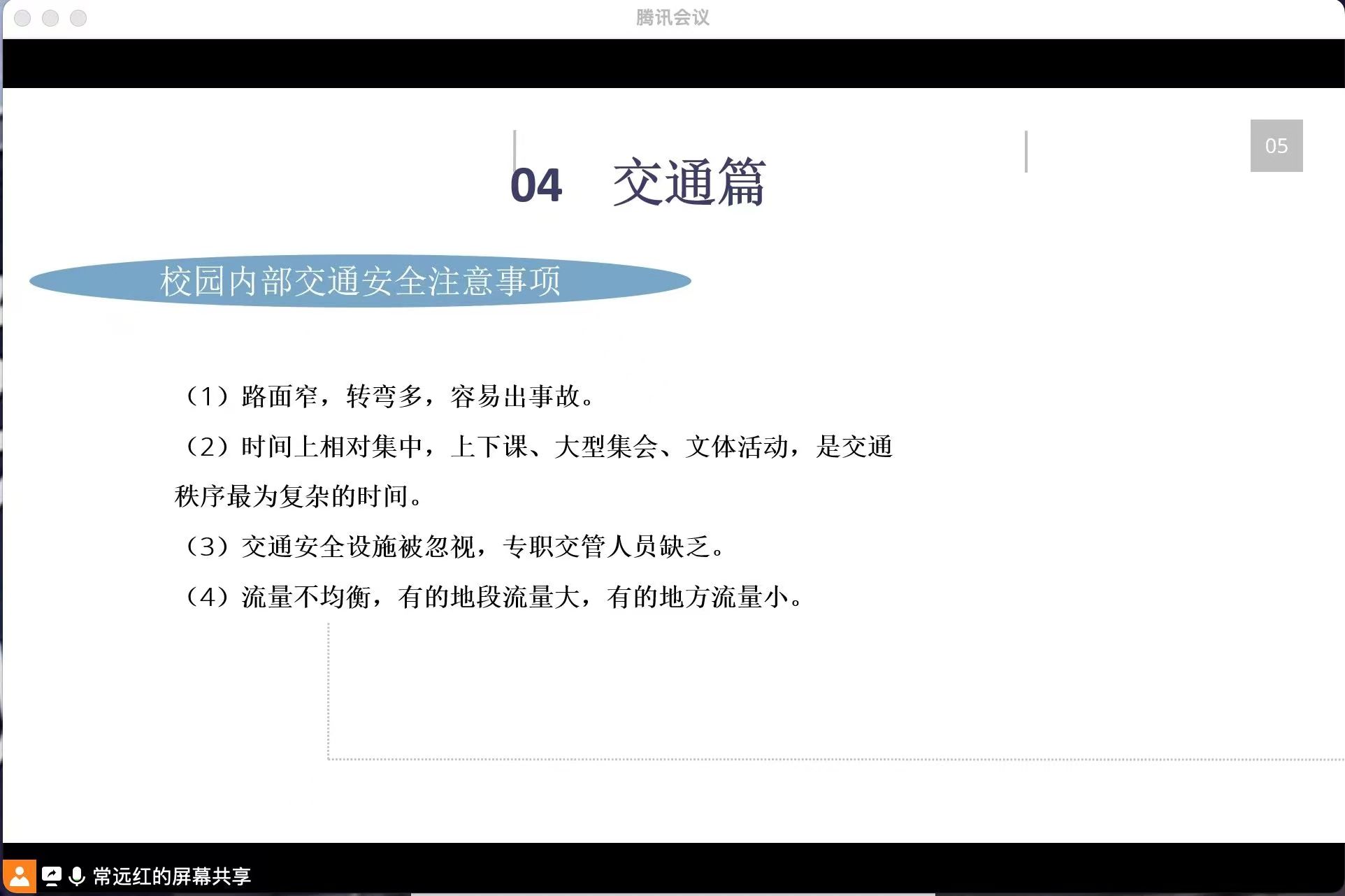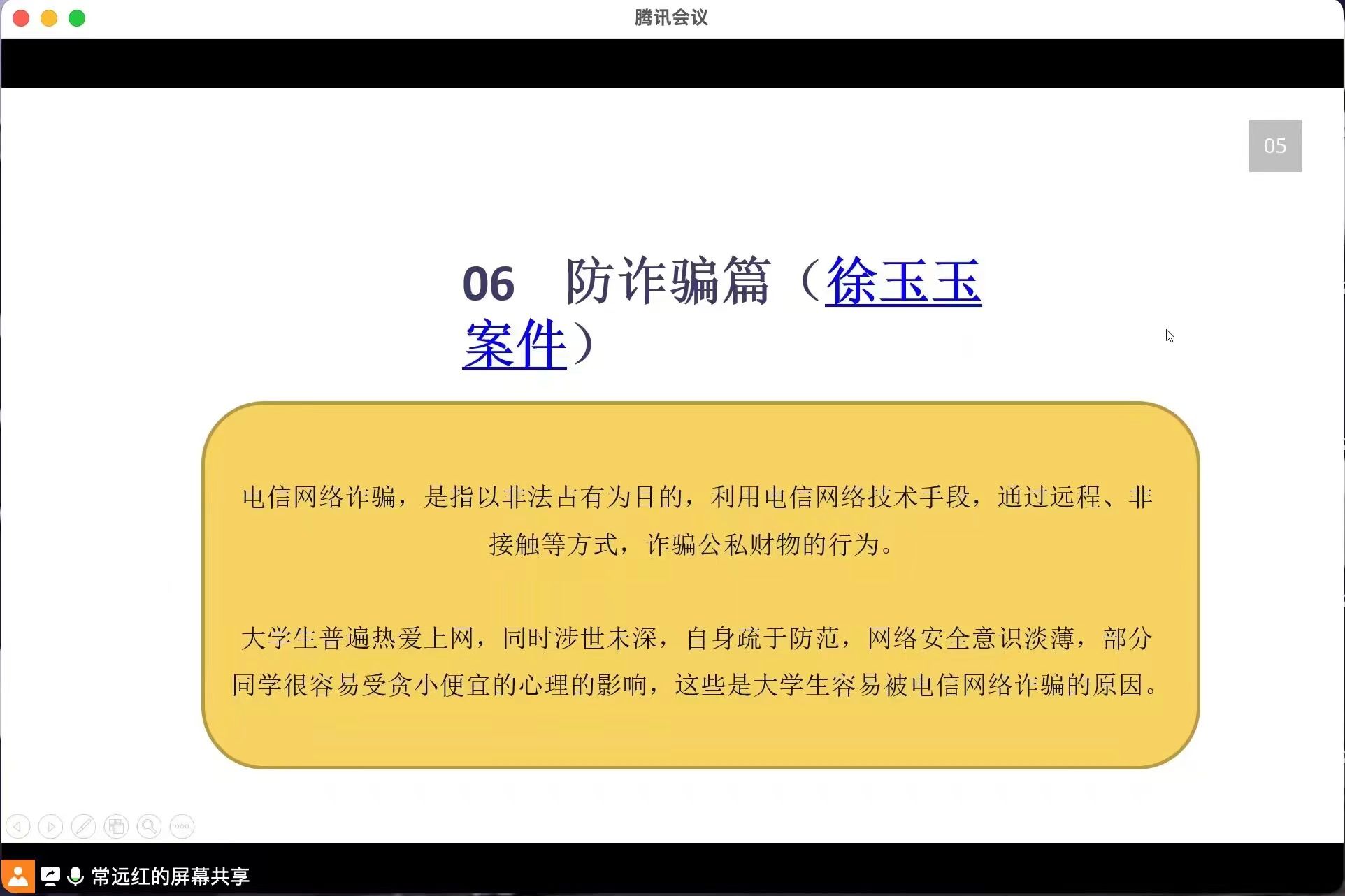 首先,常老师讲了防盗篇,用身边的案例告诉同学们防盗的重要性并向同学们介绍了防盗的基本方法,增强了同学们在日常生活的防范意识。其次,常老师讲了消防篇,向同学们分享了真实案例,并介绍容易起火的几种方式、预防措施及发生火灾时的报警电话。着重讲了如何预防宿舍火灾以及宿舍火灾隐患。接着,常老师展开了交通篇,讲了校园内部交通安全注意事项以及作为大学生应注意的问题,用2010年全国道路交通事故这一血淋淋的事例告诉同学们交通安全的重要性,并向同学们科普了交通安全常识。其后,是防诈骗篇,常老师先给同学们播放了经历过电信诈骗的徐玉玉真实案例的视频,让同学们重视电信诈骗发生的严重后果,然后给同学们教避免上当受骗方法,提高同学们的警惕性。然后,是生活安全篇,常老师向同学们讲了日常生活中可能发生的不安全事故,并告诉同学们遇到了不安全事故的应对措施,便于更好的预防不安全事故的发生。最后,常老师提醒同学们虽然疫情已经过去,但个人防护还是不能掉以轻心,在日常生活中尽量戴口罩,勤洗手,注意个人卫生和防护。